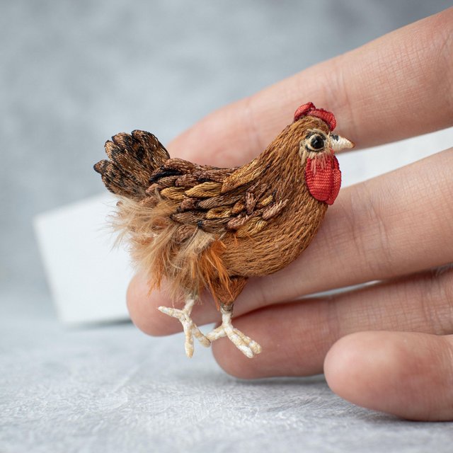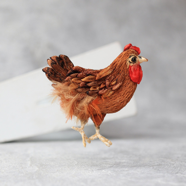 The Hen is a classic PolaLab brooch which is recreated since 2016. In January 2019 the chicken brooch had some new changes: realistic legs, separate behind embroidered leg which makes it even more 3d. Classic colours are: white, black and ginger. It is also possible to order a custom colour bird.