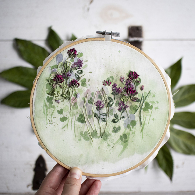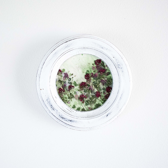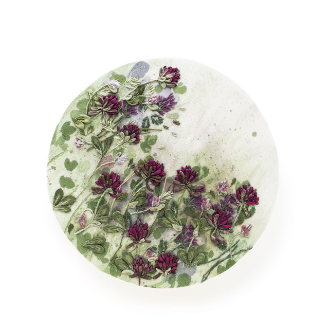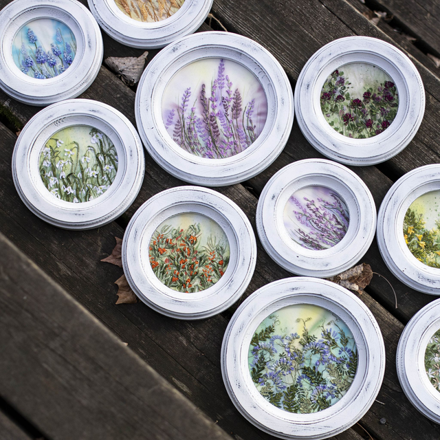 The "Botanical studies" collection by Polina Laamanen is a profound exploration of embroidery techniques featuring hand-modified textile elements. Each piece meticulously imitates a photographic depth, blurring the background to emphasize detailed, intricate foregrounds of floral and botanical motifs. The works range from 11 cm to 17 cm in diameter, with each inviting a closer examination of the unique texture and form of plant subjects. Each artwork is framed in a white round frame. Polina aspires to expand this technique into larger formats, dreaming of creating a massive, 1-meter round artwork depicting a field of white clover.