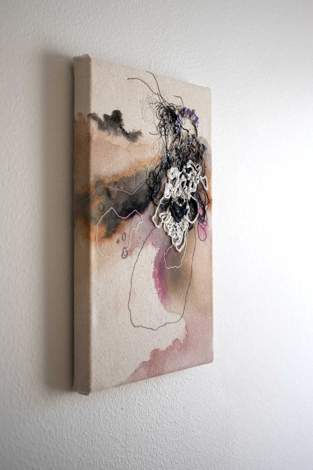 In this new body of work, hand embroidery and painting converge to create richly textured, tactile compositions. Abstract backgrounds—often leaving areas of raw canvas exposed—set the stage for layered embroidered motifs that reference botanical forms. These natural elements, drawn from the artist’s earlier series of botanical studies, now appear in a more deconstructed, interpretive context.