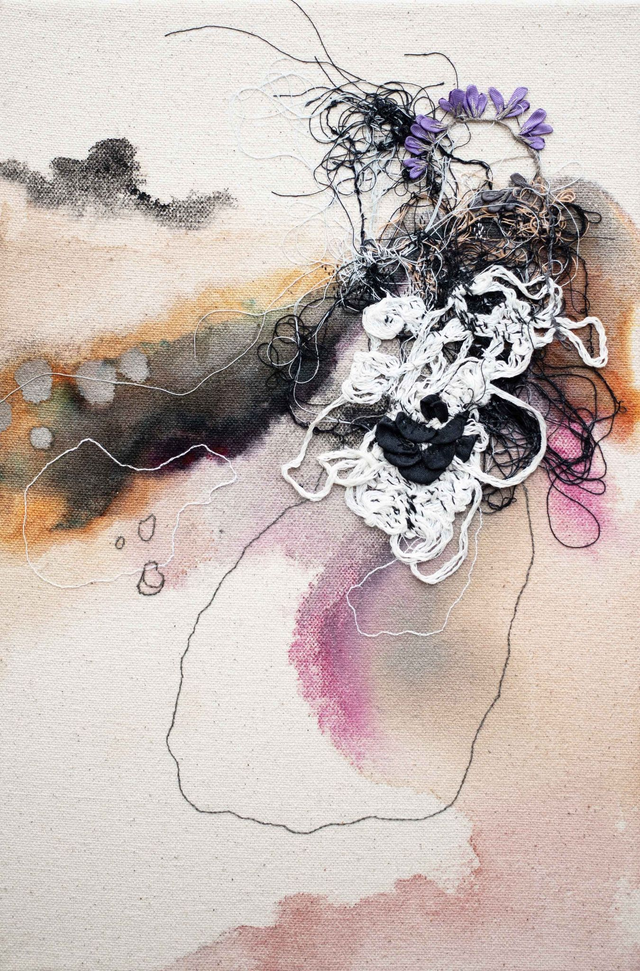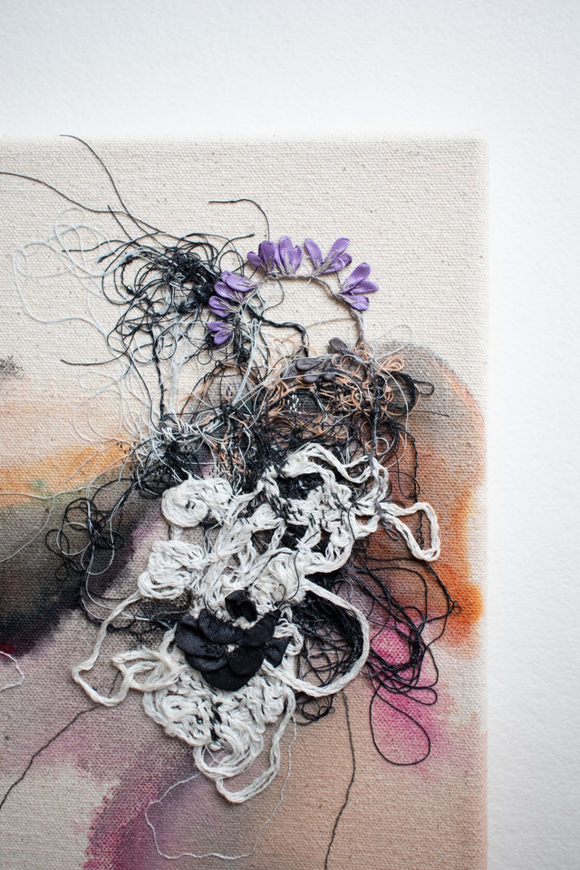 Acrylic paint on cotton canvas, hand embroidery with modified textile, vintage cotton threads and DMC embroidery floss.