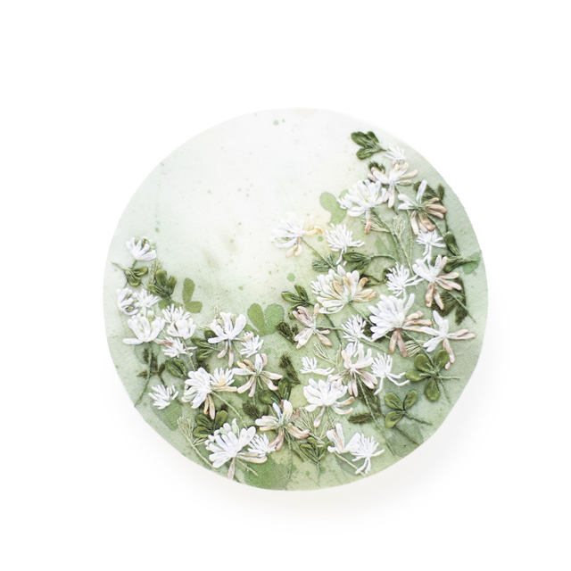 The "Botanical studies" collection by Polina Laamanen is a profound exploration of embroidery techniques featuring hand-modified textile elements. Each piece meticulously imitates a photographic depth, blurring the background to emphasize detailed, intricate foregrounds of floral and botanical motifs. The works range from 11 cm to 17 cm in diameter, with each inviting a closer examination of the unique texture and form of plant subjects. Each artwork is framed in a white round frame. Polina aspires to expand this technique into larger formats, dreaming of creating a massive, 1-meter round artwork depicting a field of white clover.